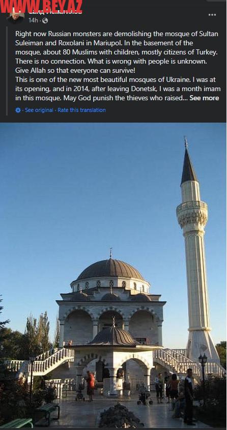 Məscidin axundu Səid İsmailov sosial media hesabından verdiyi açıqlamada “Möhtəşəm Süleyman məscidi Ukraynanın ən gözəl məscidlərindən biridir, indi ruslar onu sökür. Heç bir əlaqə yoxdur. Məscidə sığınanların taleyi isə məlum deyil” deyə məlumat verib.