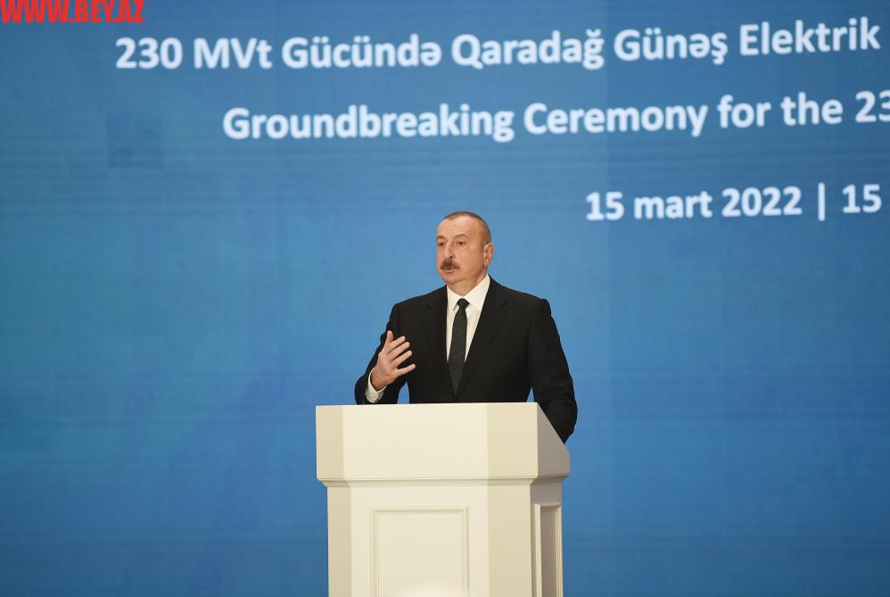 “Bu gün ölkəmizin energetika sahəsində çox əlamətdar bir gündür. Bu gün Qaradağ Günəş Elektrik Stansiyasının təməli qoyulur. Bu münasibətlə sizi və bütün Azərbaycan xalqını ürəkdən təbrik etmək istəyirəm. Doğrudan da çox önəmli bir hadisədir, 230 meqavat gücündə olan bu stansiya həm ölkəmizin enerjiyə artan tələbatını ödəyəcək, eyni zamanda, ixrac imkanlarımızı da genişləndirəcək”.
