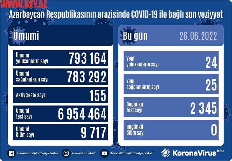 Azərbaycanda son sutkada koronavirus infeksiyasına 24 yeni yoluxma faktı qeydə alınıb, 25 nəfər müalicə olunaraq sağalıb və evə buraxılıb.