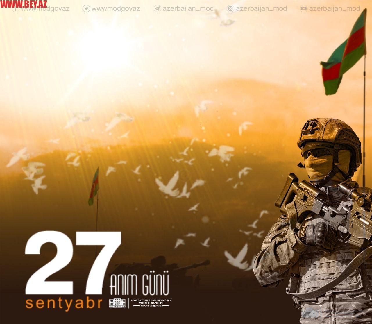 Azərbaycanın Müdafiə Nazirliyi tviter hesabında 27 sentyabr Anım Günü ilə bağlı paylaşım edib.