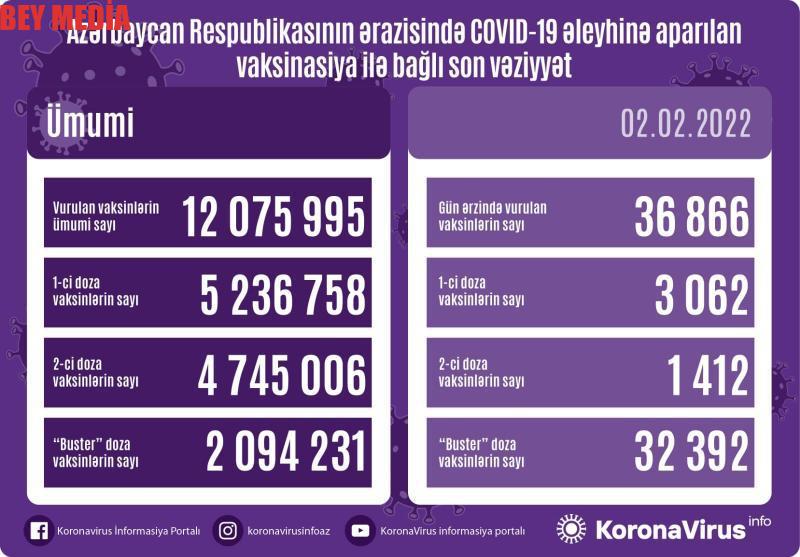 Ölkədə vurulan vaksinlərin ümumi sayı 12 075 995, birinci mərhələ üzrə vaksinasiya olunanların ümumi sayı 5 236 758, ikinci mərhələ üzrə vaksinasiya olunanların sayı 4 745 006, buster doza üzrə vaksinasiya olunanların sayı isə 2 094 231 təşkil edir.