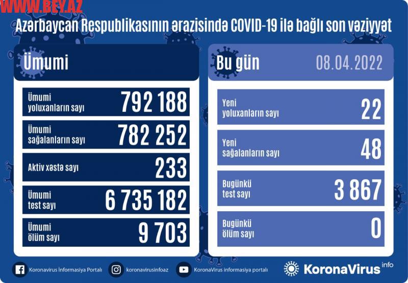 Azərbaycanda koronavirus (COVID-19) infeksiyasına 22 yeni yoluxma faktı qeydə alınıb, 48 nəfər müalicə olunaraq sağalıb.