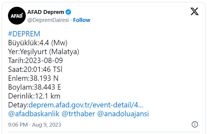 Malatyanın Yeşilyurt rayonunda Rixter cədvəli ilə 4,4 bal gücündə zəlzələ baş verib.