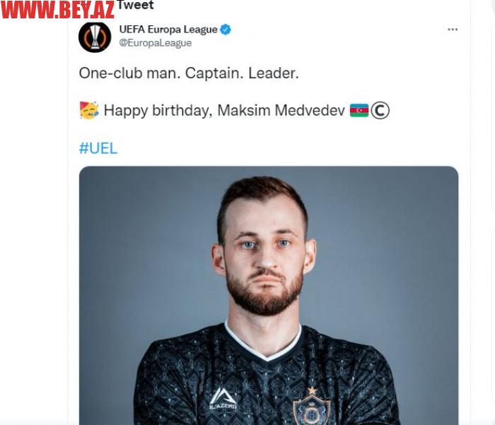 UEFA Azərbaycan millisi və “Qarabağ”ın kapitanı Maksim Medvedevi doğum günü münasibətilə təbrik edib.