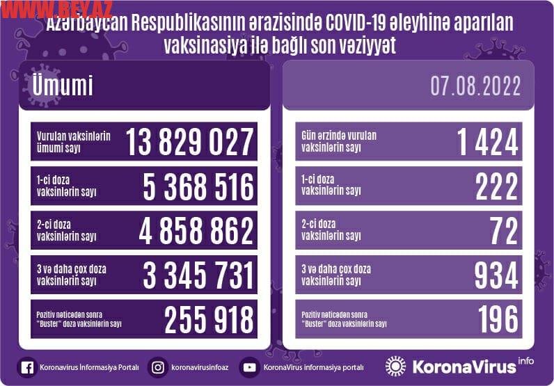 Azərbaycanda son sutkada koronavirus (COVID-19) əleyhinə 1424 vaksin vurulub.